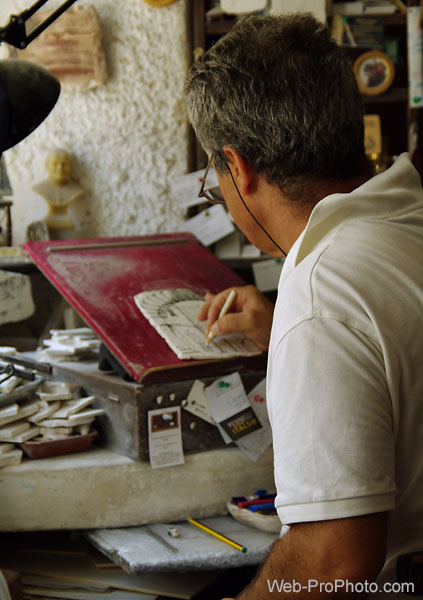 今回の出品作品のなかでわたしの一番のお気に入りは「兄妹」の写真。白い石造りの教会を背景に、帽子をかぶった少年と栗色の髪の幼い少女が戯れる、何気ない穏やかな日常のひとコマです。もうひとつは白いポロシャツを着た老職人の後姿。工房で作業に集中する背中が「空気」に張りつめた緊張感を与えています。作品群には、モノトーンのマテーラの写真も数点加えました。こちらは廃墟の町と、そこに住む人々との生命感のコントラストを楽しんでいただけたらと思い、セレクトいたしました。
